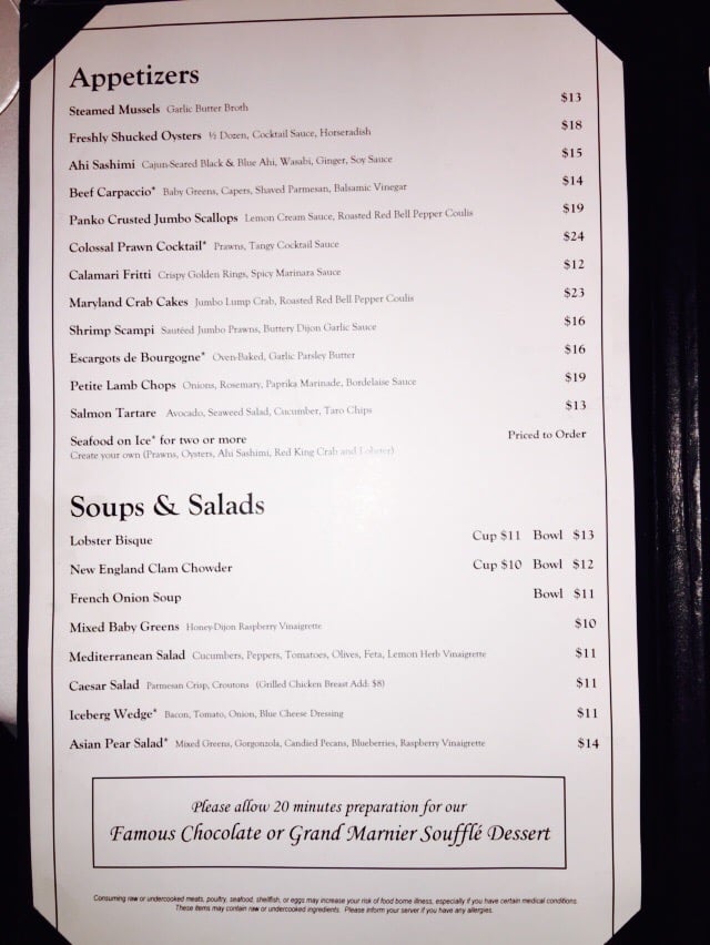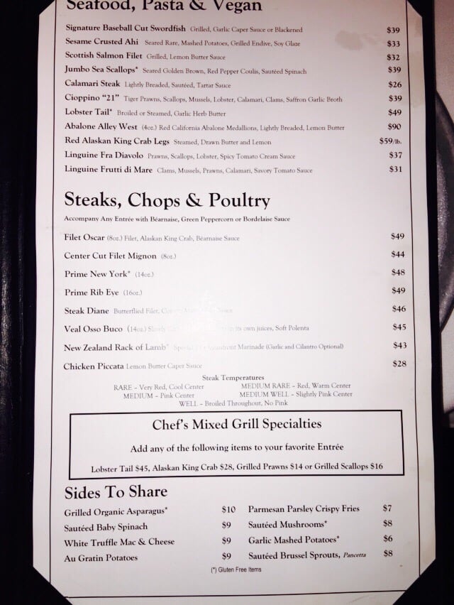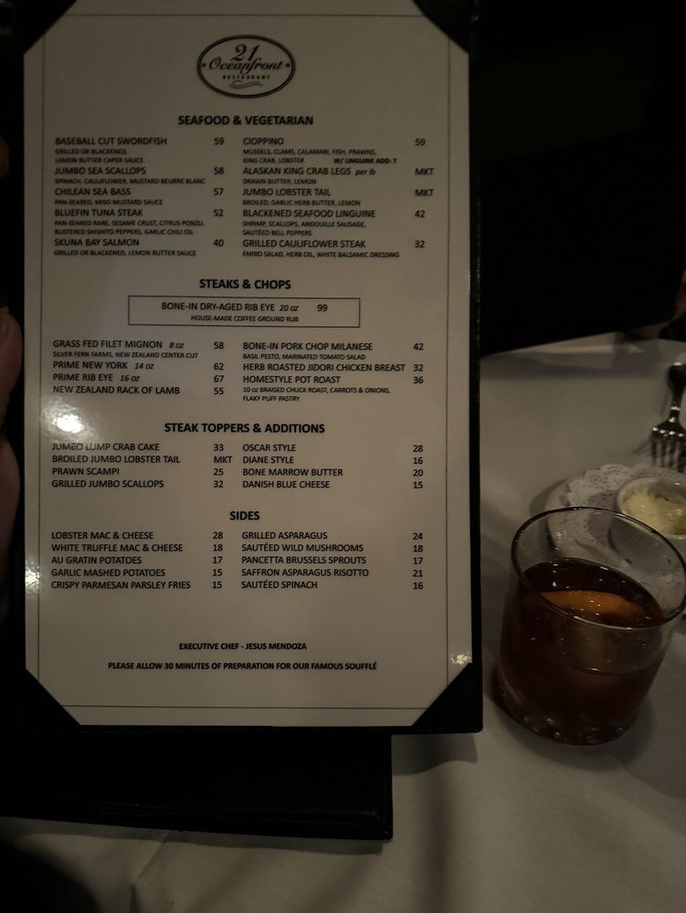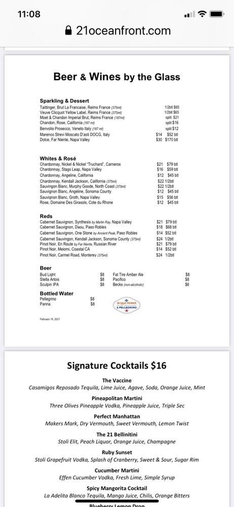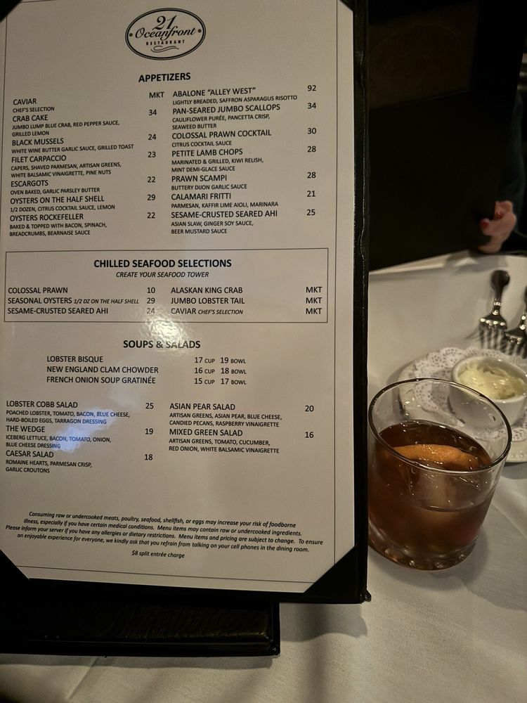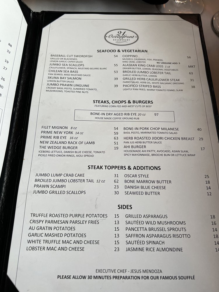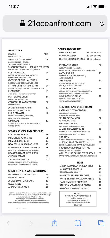 Introducing the menu at 21 Oceanfront, a wine bar and seafood restaurant located in Newport Beach, CA, offers a variety of appetizers like Steamed Mussels and Beef Carpaccio, along with soups and salads such as Lobster Bisque and Caesar Salad. Their seafood, pasta, and vegan options include Scottish Salmon Filet and Seared Marinated Tofu. Customers have raved about the ambiance, service, and delicious dishes, like the Cioppino and Softball Cut Swordfish. The upscale atmosphere, live music, and valet parking add to the overall dining experience. With a diverse menu, elegant decor, and exceptional service, 21 Oceanfront is a must-visit destination for a special evening out.